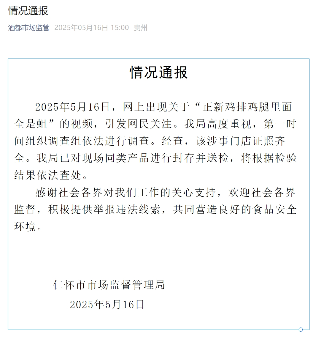 5月16日,仁怀市市场监督管理局发布通报:2025年5月16日,网上出现“正新鸡排鸡腿里面全是蛆”的视频,引发广泛关注。该局高度重视,第一时间组织调查组进行调查。经查,涉事门店证照齐全,该局已对现场同类产品进行封存并送检,将根据检验结果依法查处。