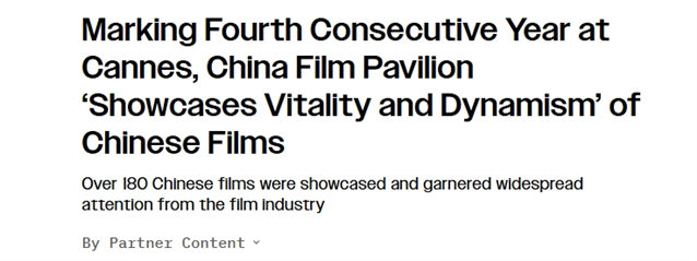 当地时间5月15日,美国《综艺》杂志发表文章,题为:亮相戛纳国际电影节,中国电影联合展台展现中国电影生机与活力,吸引全球目光。