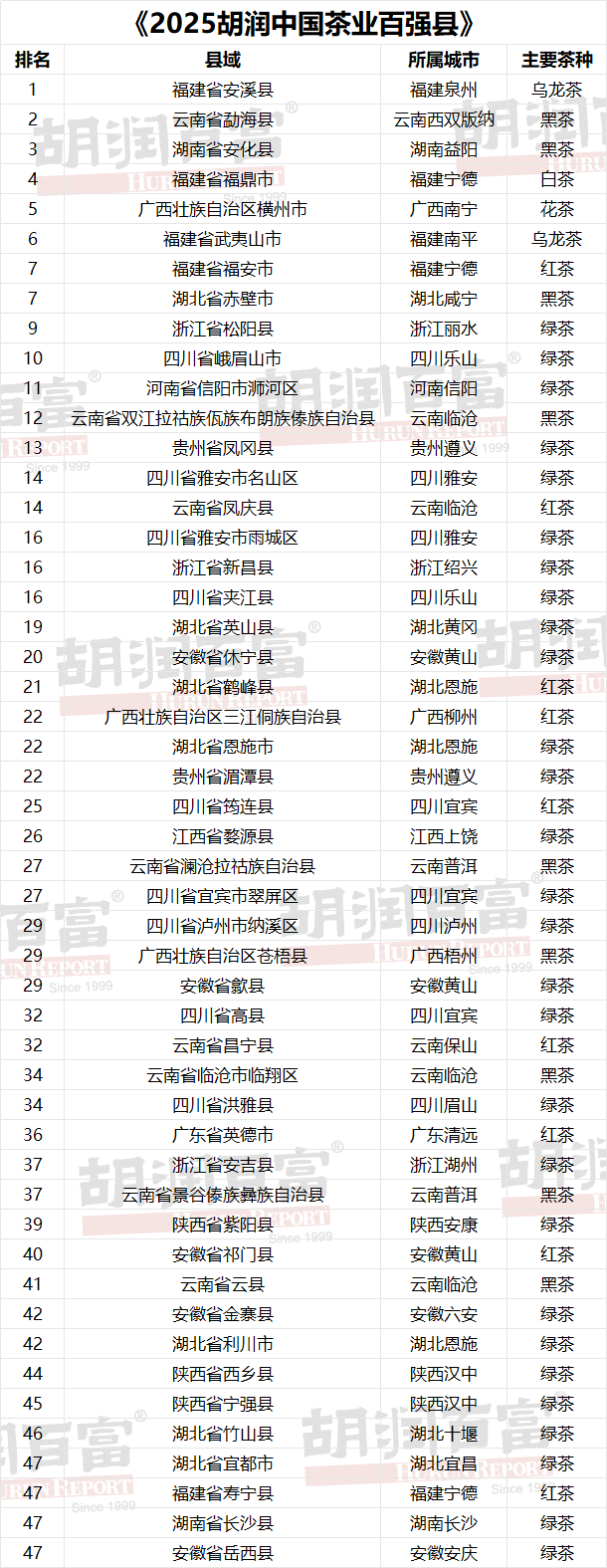 5月19日,胡润研究院发布《2025胡润中国茶业百强县》榜单,福建省安溪县排名第一,云南勐海、湖南安化等位列前五,展示了中国茶产业的强劲实力。