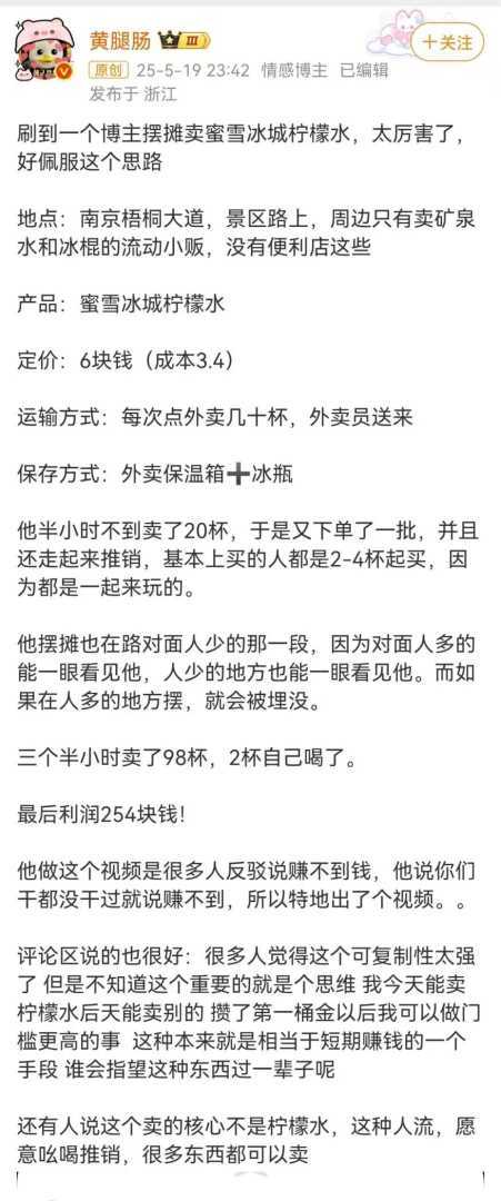据发布者“黄腿肠”介绍,在南京梧桐大道景区,由于周边仅售卖矿泉水和冰棍,一位博主发现了商机,通过外卖一次性订购了数十杯蜜雪冰城柠檬水,并利用外卖保温箱搭配冰瓶保存,在景区道路对面显眼但人少的位置摆摊售卖。该博主将原价4元的柠檬水定价为6元,仅半小时便售出20杯,并迅速补货。三个半小时内,累计卖出98杯(含自饮2杯),获利254元。