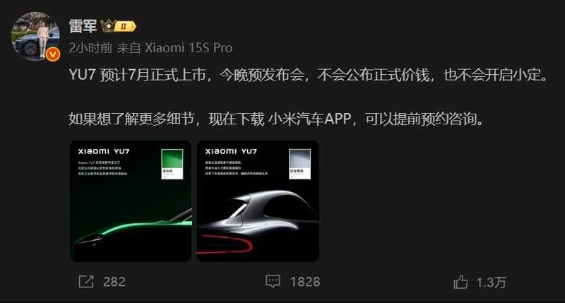 5月22日,小米集团董事长雷军宣布,YU7将于7月正式上市,并于当晚举行预发布会。预发布会将不公布售价及开启预售,为消费者留下悬念。雷军表示YU7将是一款集创新与性价比于一身的智能手机。