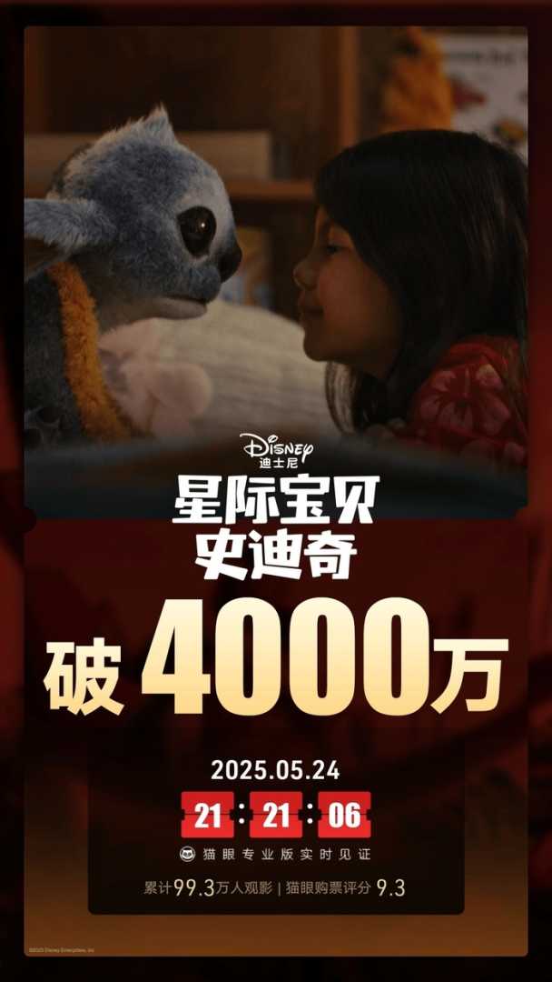 据猫眼专业版数据,电影《星际宝贝史迪奇》上映短短2天,其总票房已经成功突破4000万大关,显示出该影片的强大号召力和观众的热烈反响。