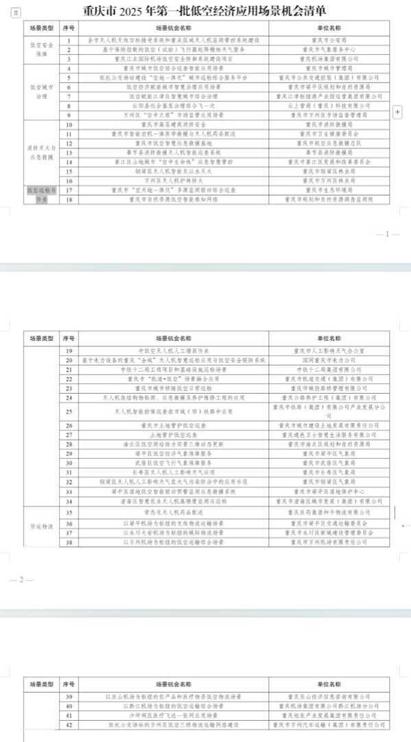 重庆市发展改革委公示《重庆市2025年第一批低空经济应用场景机会清单》,包含42项创新应用场景,涉及低空安全保障、城市治理等领域。无人机配送、智慧物流等应用为市民带来便利,无人机巡检守护城市基础设施安全,重庆有条件打造低空服务“推广地”。
