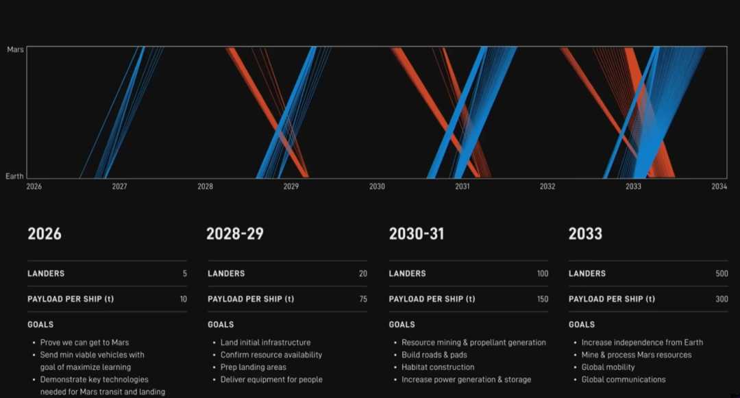 若成功,2028年窗口期或尝试载人火星登陆,建立火星基建。马斯克表示,可能先使用机器人登陆,第三个窗口期再送人类去火星。未来4个窗口期内,SpaceX将发射数百艘星舰,建立火星文明基建、星际互联网。