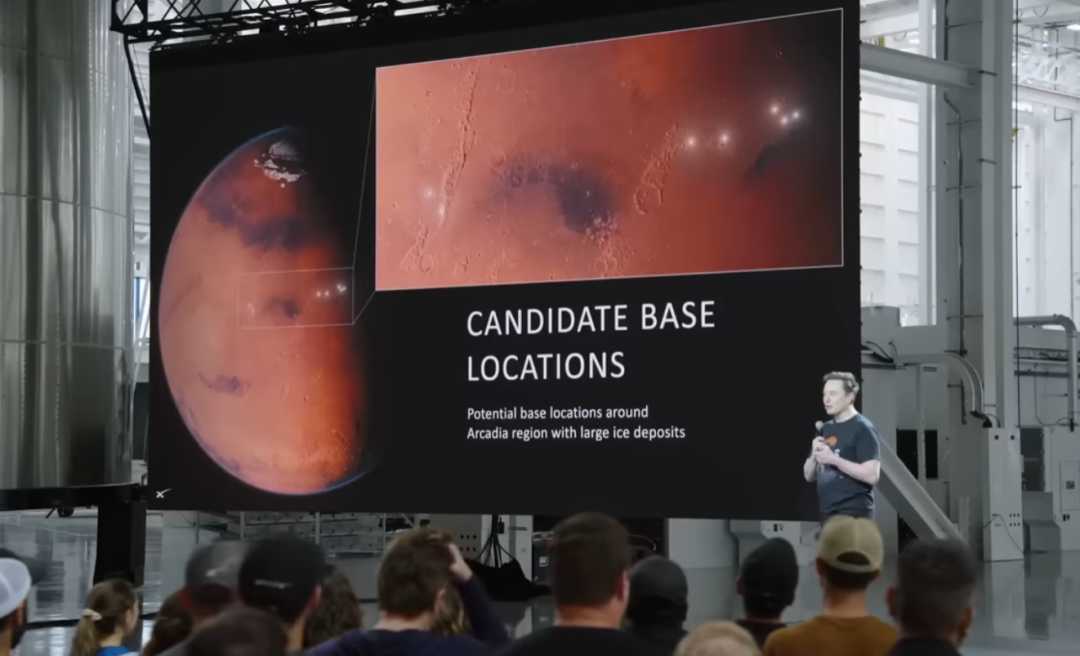 火星阿卡迪亚地区被视为建立基地的理想地点,地势平坦,有冰层覆盖。马斯克猜测,需向火星投送“上百万吨”物资,才能使火星文明独立运行。