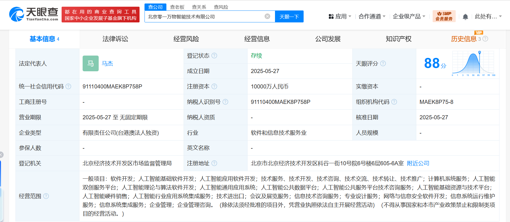北京零一万物智能技术有限公司正式成立,注册资本1亿人民币,经营范围涵盖软件开发及多个与人工智能相关的领域,由零一万物(香港)有限公司全资持股。
