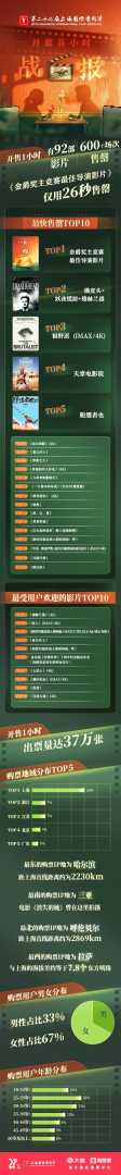 第二十七届上海国际电影节开票,众多热门场次几乎秒罄,开票1小时就有92部影片的超600场次售罄。最快售罄TOP10影片风格多样,总出票量高达37万张,女性成为购票主力。