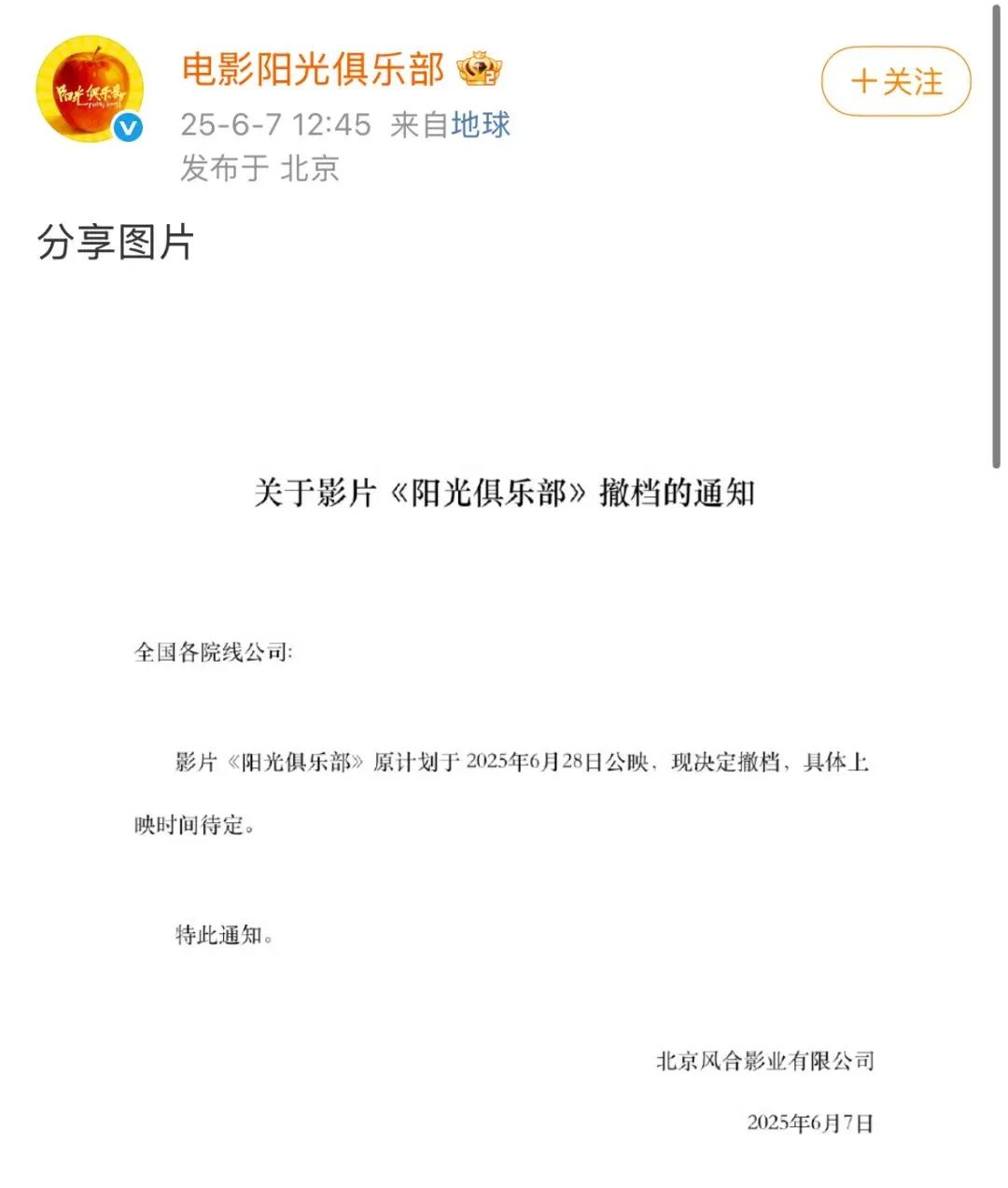 5月28日,电影《阳光俱乐部》曾宣布定档6月28日。此次撤档通知由北京风合影业有限公司发布,暂未披露撤档具体原因。