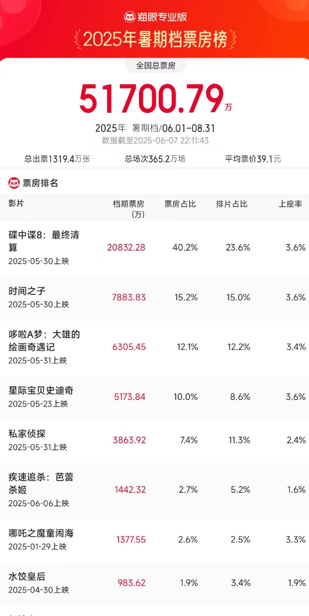 据猫眼专业版数据,截至6月7日22时,2025年暑期档总票房(含预售)已破5亿元。