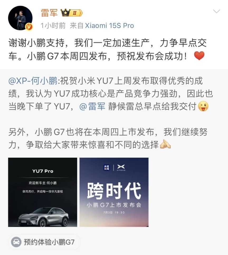 随后,小米创办人、董事长兼CEO雷军转发了何小鹏该条微博并表示:“谢谢小鹏支持,我们一定加速生产,力争早点交车。小鹏G7本周四发布,预祝发布会成功!”