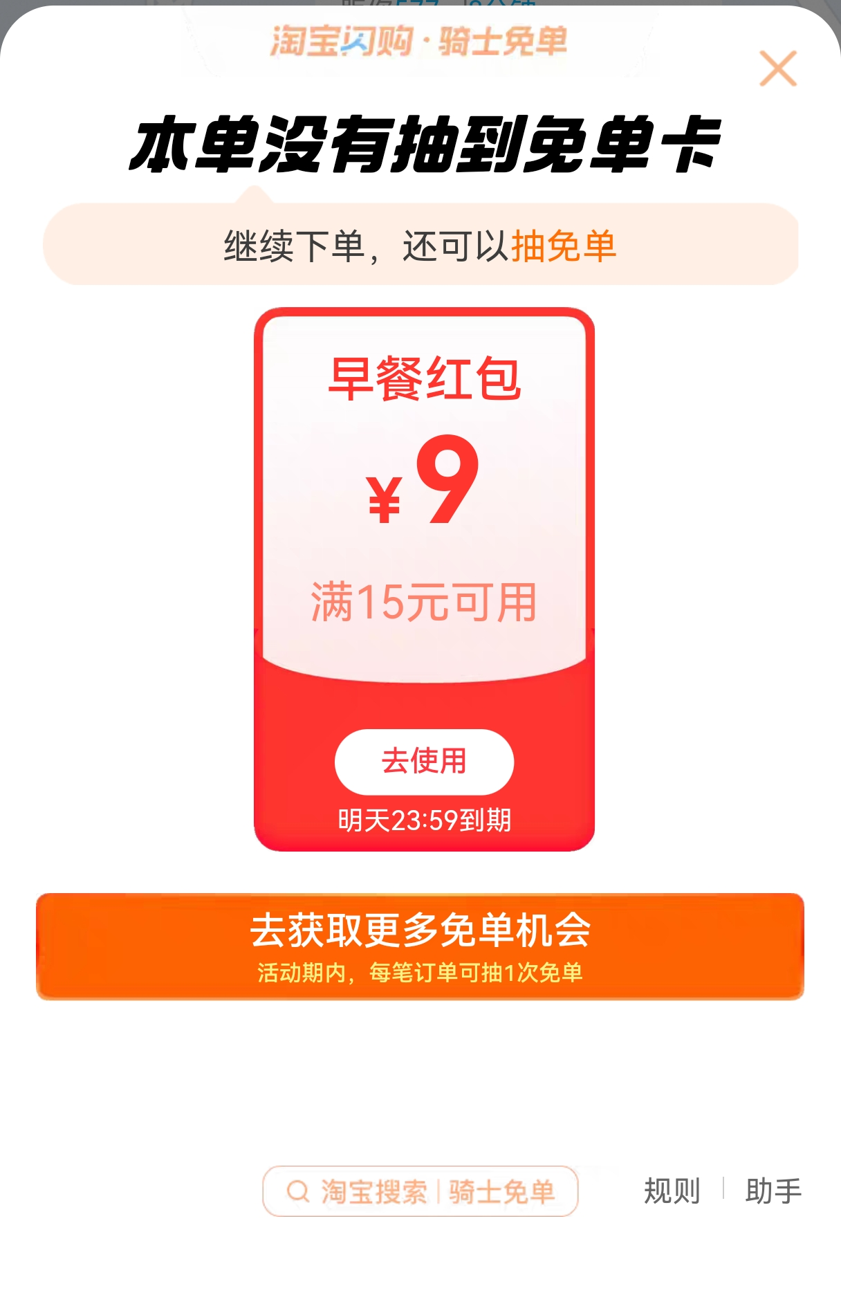 不同于美团的“0元”自取,7月12日,淘宝闪购通过发放大额红包和抽免单卡应战。财联社记者注意到,淘宝闪购除了发放大额优惠券,下单后会有骑手发送抽奖链接,可以抽取免单。