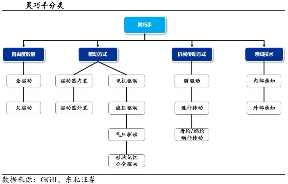 行业概况方面,灵巧手以人手24个自由度为目标,当前Tesla Optimus灵巧手已达22个自由度。按驱动与结构可分为全驱动(精度高但成本高)和欠驱动(结构简单、成本低),传动方式以腱绳(灵活度高)和连杆(成熟常用)为主。发展历经三阶段,从20世纪70年代现代灵巧手诞生,到90年代集成化设计,再到21世纪智能化与深度仿生。