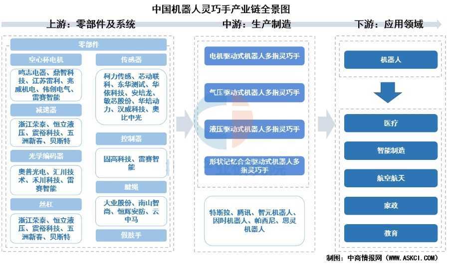 技术方案上,海外侧重腱绳传动(如Tesla),国内以连杆为主(如兆威)。硬件需平衡成本与性能,软件依赖深度学习但缺乏开源数据。产业链上游核心部件中,空心杯电机海外占85%市场份额,国内鸣志电器等加速替代;中游以系统集成为主;下游应用于工业、医疗、家庭服务等领域。