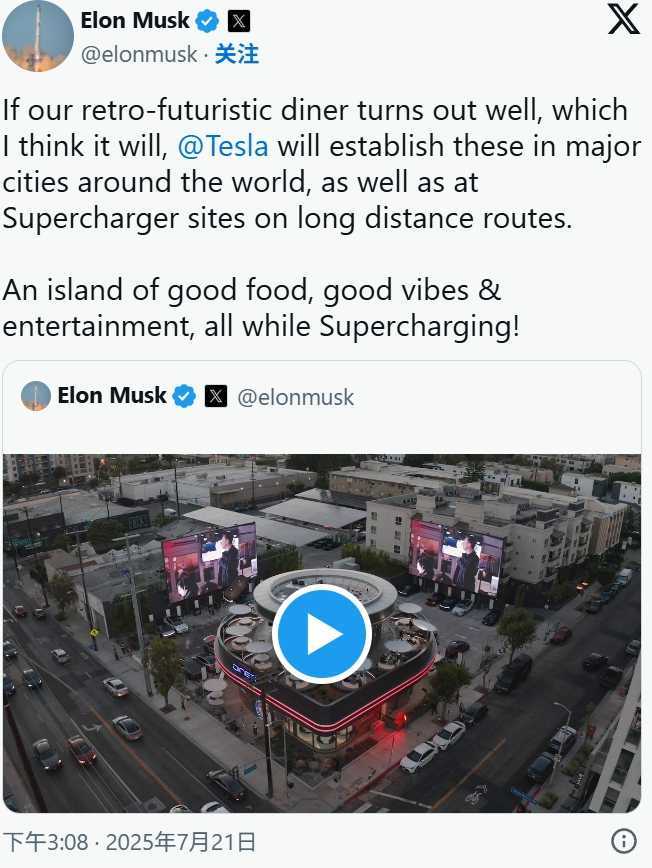 马斯克在X上写道:“如果我们的复古未来主义餐厅表现良好,我认为是会的,特斯拉将在世界各地的主要城市以及长途路线上的超级充电站建立这些餐厅。”