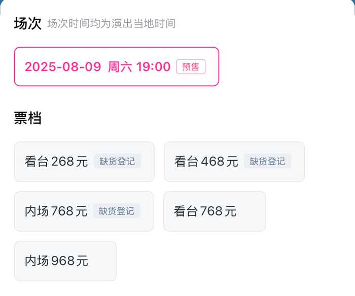 旺仔小乔的演唱会仅有8月9日这一场,截至发稿,看台268元、468元及内场768元均处于缺货状态,看台768元和内场968元仍有余票可售。