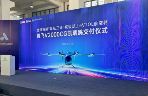 7月22日,峰飞航空科技向合利创兴智能交付全球首架获颁“适航三证”(TC、PC和AC)的吨级以上eVTOL(电动垂直起降航空器)——V2000CG凯瑞鸥。