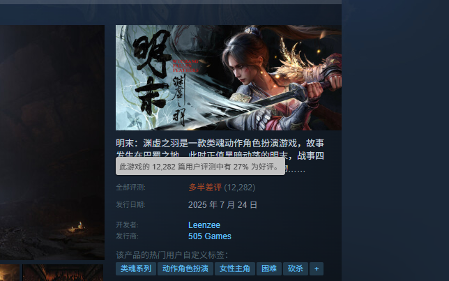 《科创板日报》7月25日讯开售不到一天,国产单机游戏《明末:渊虚之羽》(简称《明末》)便陷入口碑争议。截至发稿,该游戏在Steam平台的评价为“多半差评”,好评率仅27%。而在昨日发售数小时内,其好评率更是跌破20%,一度被评价为“差评如潮”。