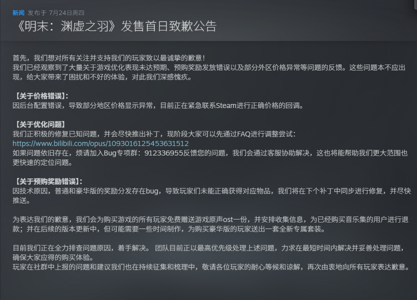 针对上述事项,《明末》官方于昨日发布致歉公告。“这些问题本不应出现,给大家带来了困扰和不好的体验,对此我们深感愧疚。”其表示,目前正在紧急联系Steam进行正确价格的回调。关于优化问题,正积极修复已知问题,并会尽快推出补丁。此外,将为所有玩家免费赠送游戏原声OST一份,为购买豪华版的玩家送出一套全新专属套装,以示歉意。