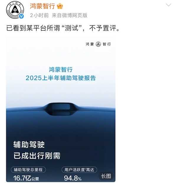 谁也没想到,一场智驾测试再度掀起车圈一周的热议。7月25日,鸿蒙智行官方微博发文:“已看到某平台所谓‘测试’,不予置评。”14个字的博文下,还配了一张长图,详细介绍了鸿蒙智行2025上半年辅助驾驶报告。