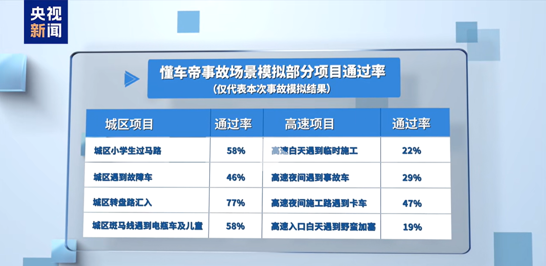 在场景难度更高的高速公路场景,通过率相对更低,其中“施工路遇卡车”场景的通过率最高,为47%;而“消失的前车”“莽撞横穿的猪”两个场景的通过率分别仅有14%、5%。