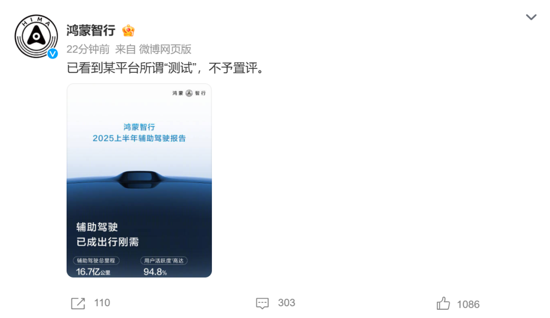 7月25日,鸿蒙智行微博发文称,已看到某平台所谓“测试”,不予置评。