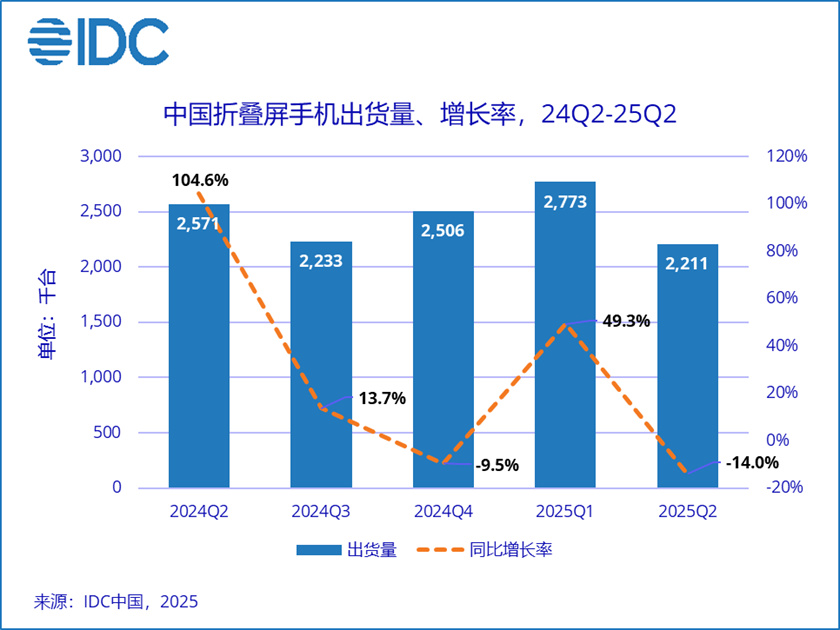 据日前IDC最新研究成果,2025年第二季度,中国折叠屏手机出货量达到221万台,同比下降14%。