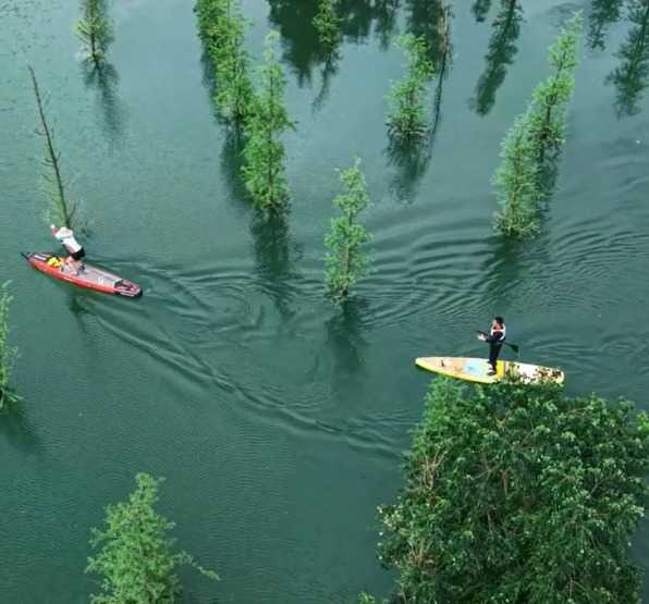 在重庆武隆的芙蓉江上,一处“水上森林”景观如同风景画一般美丽。入夏以来,“水上森林”成为桨板运动爱好者喜爱的打卡点。