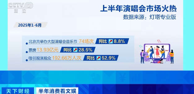 数据显示,2025年1-6月北京共举办大型演唱会、音乐节74场次,票房13.93亿元,吸引观演观众192.66万人次;同比分别增长8.8%、28.5%、52.9%。而从全国来看,今年上半年,全国演唱会票房同比增长约四成,这一数据凸显了演出市场的繁荣。