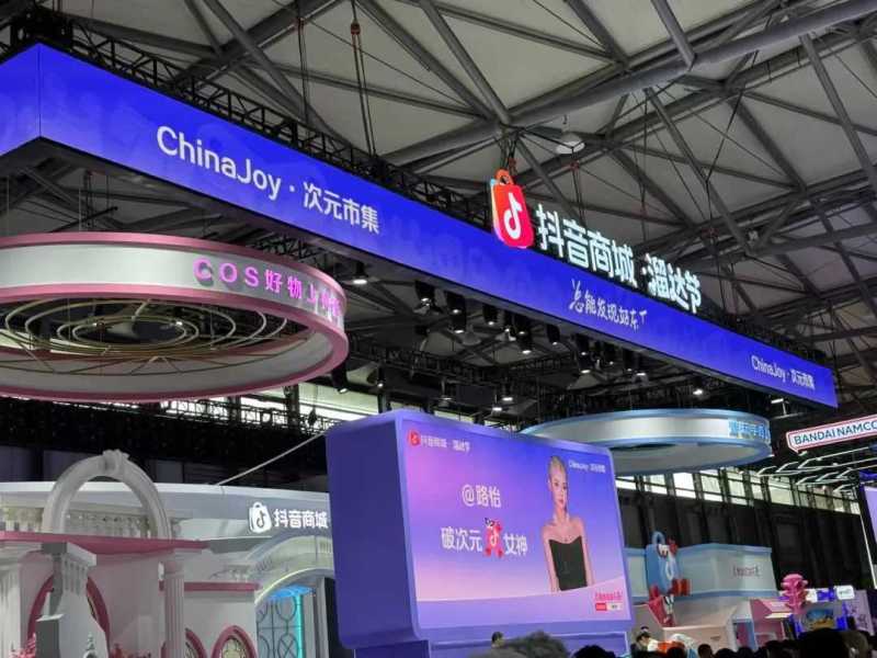 抖音商城今年也在ChinaJoy布局,展台规模更大。以“溜达节”IP亮相,设置手办、COS、美妆、电玩等主题展区,将直播间搬进展馆,为商家提供沉浸式带货场景。
