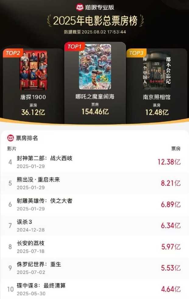 截至8月2日17时54分,电影《南京照相馆》累计票房(含预售)超12.48亿元,进入2025年度票房榜前三,持续领跑2025年暑期档票房榜,电影市场表现强劲。