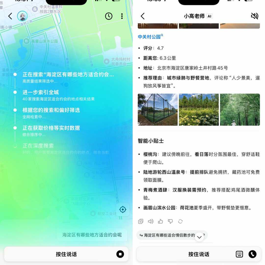 记者让AI助手小高老师汇总“北京海淀区最适合约会的地方”,AI助手会从距离远近、评分、价格等维度筛选并推荐合适的地点。