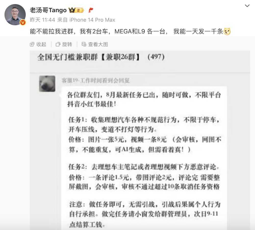 就在一天前,理想汽车产品负责人汤靖晒出一张网络水军组织抹黑理想汽车的兼职群聊天截图,并调侃称,“能不能拉我进群,我有2台车,MEGA和L9各一台,我能一天发一千条。”