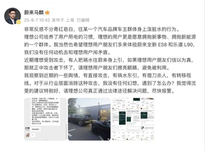 他写道,“非常反感不分青红皂白,往某一个汽车品牌车主群体身上泼脏水的行为。”“近期理想受到攻击,有人把祸水往蔚来身上引,如果理想用户朋友们信以为真,那就正中攻击者下怀了。”