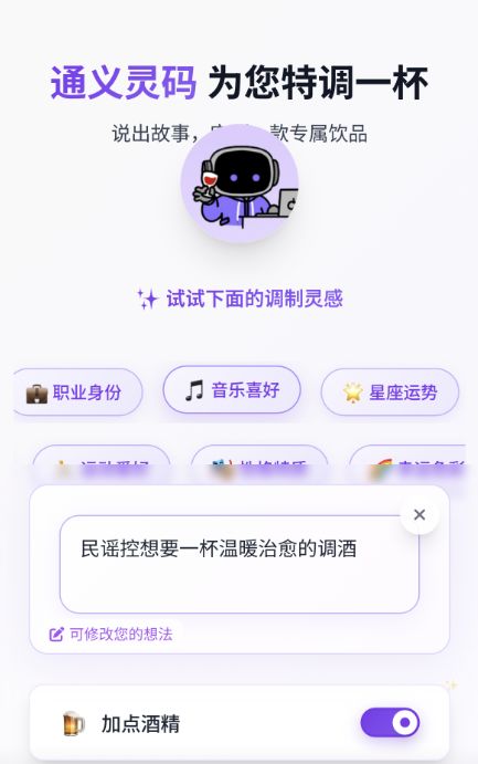 进入界面,消费者可以输入自己当日的心情、想法,或是自己的星座、MBTI,甚至是自己的“调制灵感”。只要几秒,这位“AI调酒师”便会为你定制推荐出一杯“独一无二的AI调制配方”。