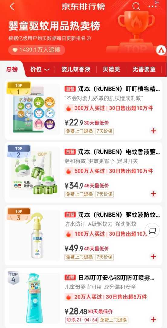 京东平台显示,植物精油防蚊贴、电热蚊香液、驱蚊喷雾等润本产品位列京东婴童驱蚊用品热卖榜前三,30日售出量均超10万件。