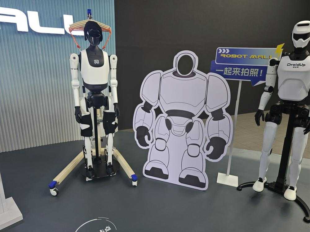 步入机器人4S店的展厅,首先看到的便是一只充满未来感的机械巨臂和两台迎宾机器人,它们正作为拍照打卡点迎接顾客的到来。