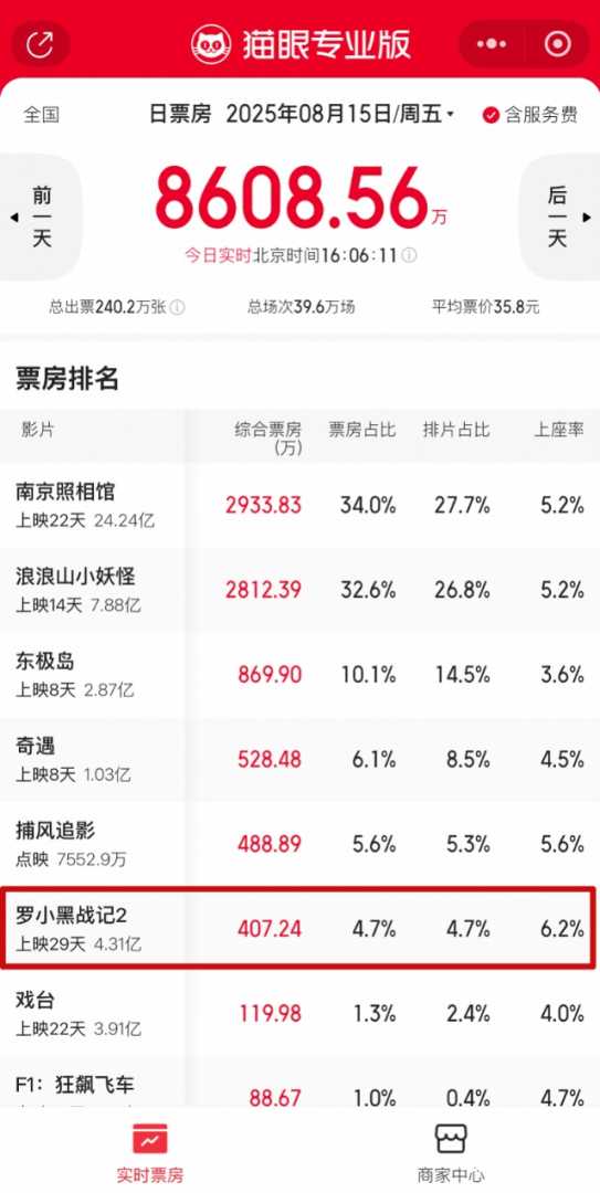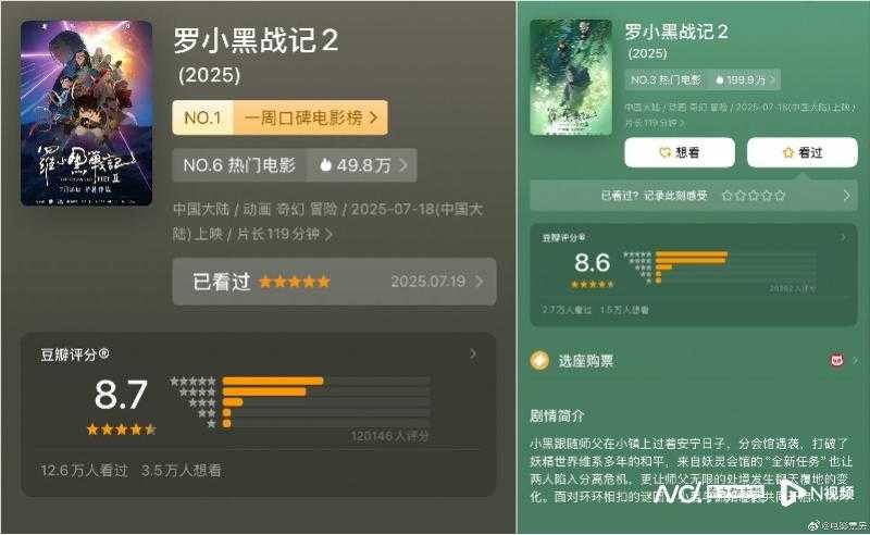 动画电影成为暑期档“黑马”。截至8月15日,票房前五影片中动画电影占两席,《浪浪山小妖怪》累计票房7.88亿元,《罗小黑战记2》达4.3亿元。《罗小黑战记2》上映2天票房7000万,豆瓣评分8.7,但票房仅列第五,排片占比中低。
