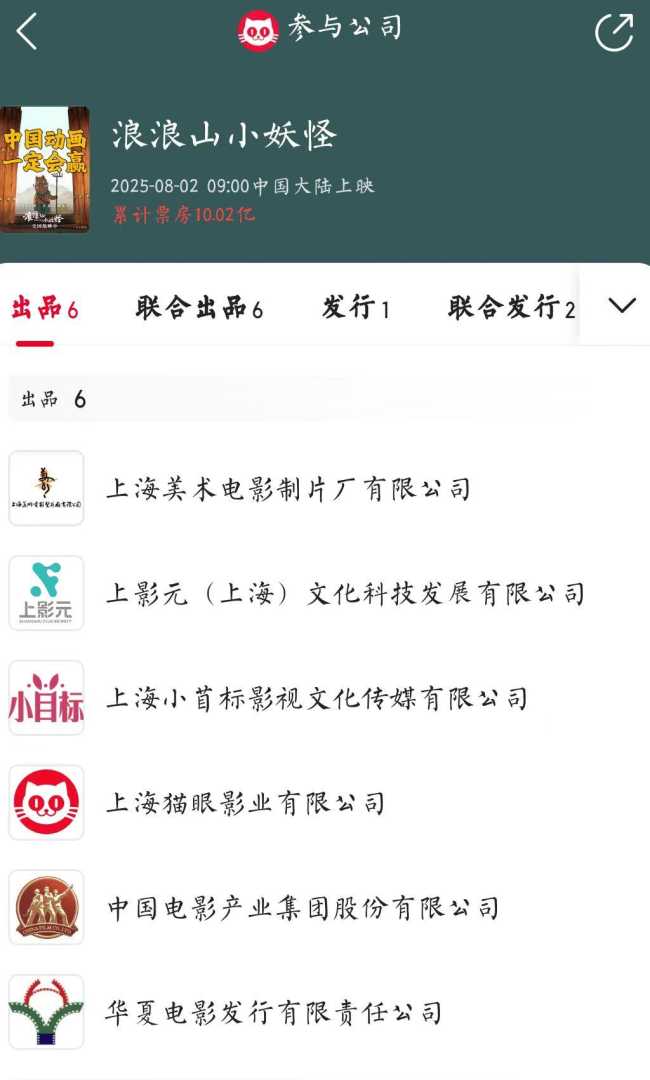 猫眼专业版App显示,《浪浪山小妖怪》出品方涉及多家上市公司,其中上影元为A股上市公司上海电影子公司;中国电影是电影的参投方之一。
