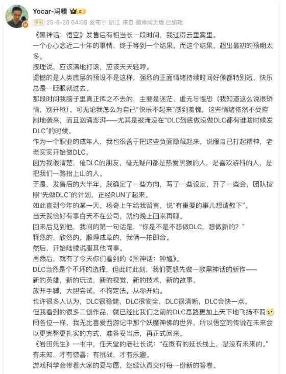 8月20日,相关话题冲上热搜。游戏科学创始人、CEO冯骥发文解释推出新作原因,表示更想先做一款黑神话的新作,新的英雄、玩法、视觉、技术和故事,悟空传说未来会以更完整方式回来。