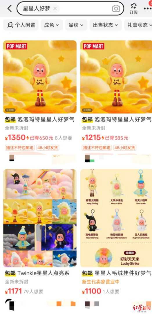 在二手平台,多款新品未卖先火。在闲鱼平台,“SKULLPANDA 熊怠怠毛绒公仔挂件”的转手标价达到350元,其中一个链接有932人浏览,35人想要。原价474元的全套“星星人好梦气象局系列——毛绒挂件盲盒”在二手平台的端盒价(一盒6个)达到1350元。该系列单个发售价为79元,目前的转手标价多在150元以上。