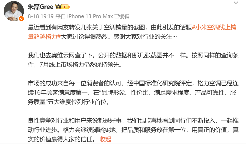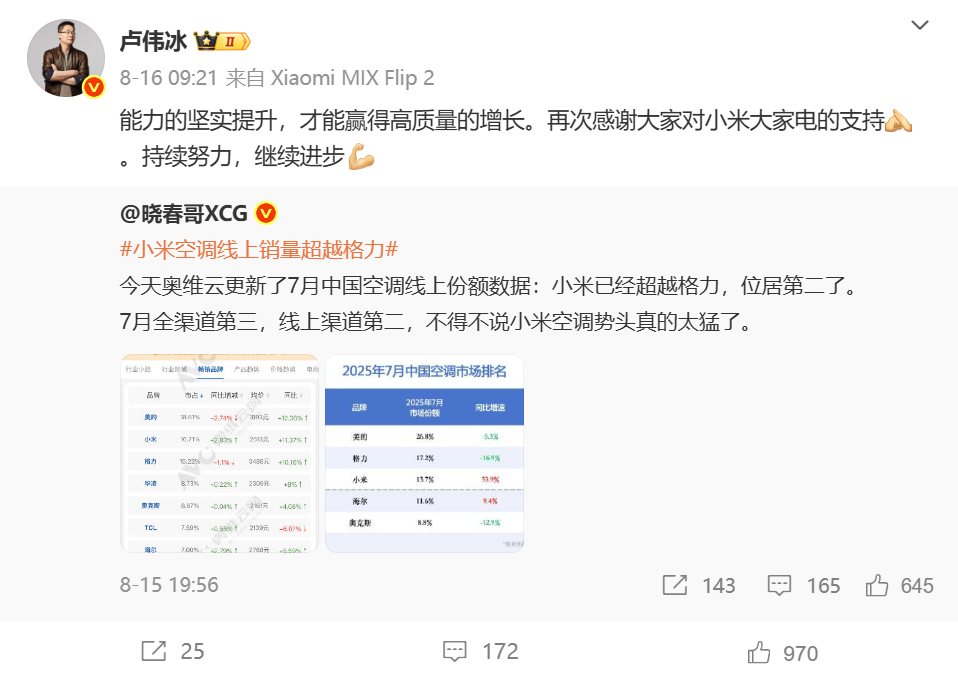 事件起因是,小米集团(01810.HK)合伙人、总裁卢伟冰8月16日在微博转发用户“晓春哥XCG”的一条帖子,该帖子截图显示,7月中国空调线上销售份额排行榜上,小米已经超越格力,位居第二。