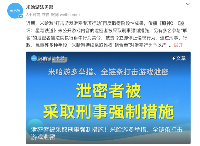 米哈游严打游戏泄密,泄密者被采取刑事强制措施