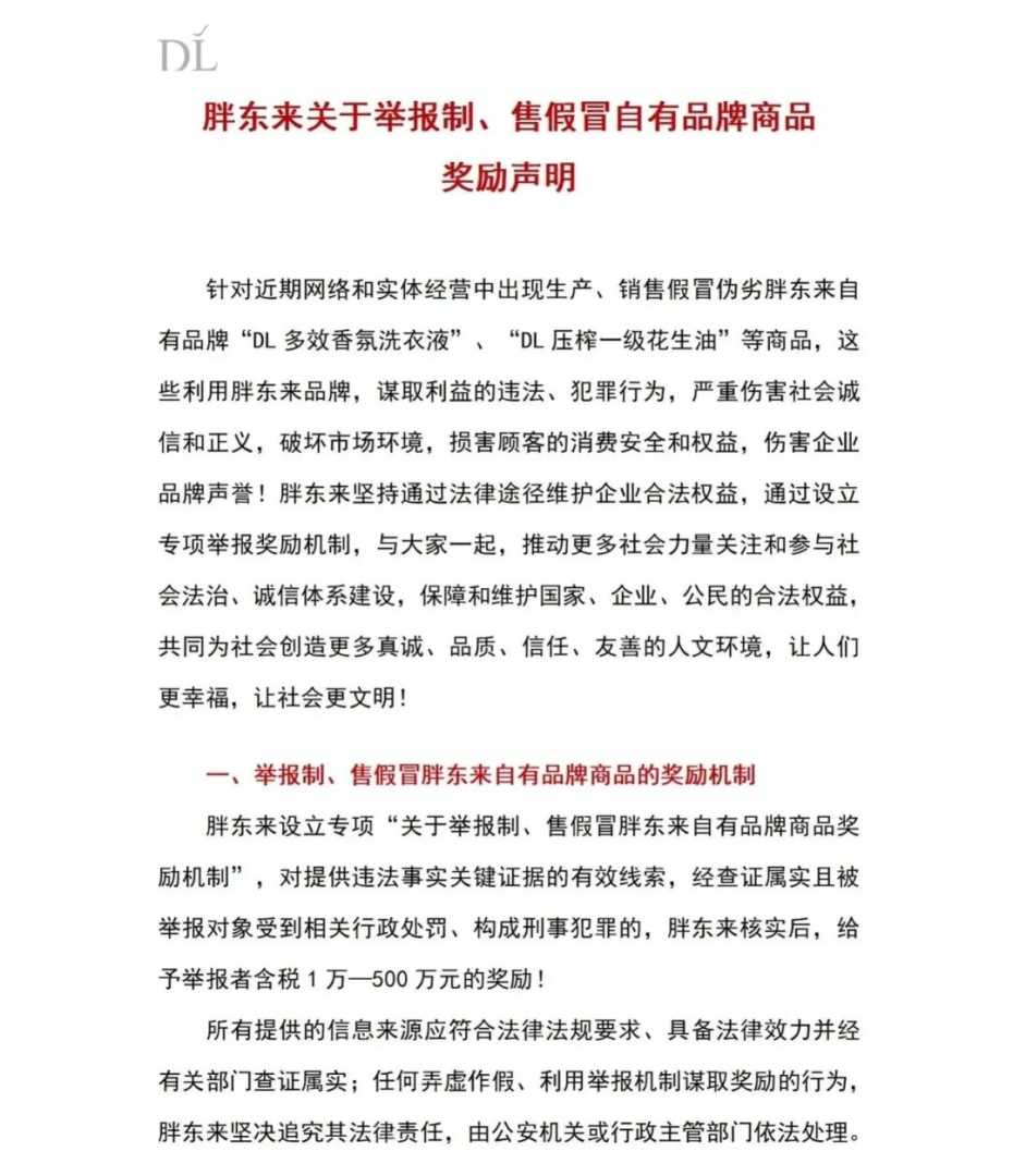 9月1日,胖东来发布关于举报制、售假冒自有品牌商品奖励声明:针对近期网络和实体经营中出现生产、销售假冒伪劣胖东来自有品牌‘DL 多效香氛洗衣液’、‘DL压榨一级花生油’等商品,这些利用胖东来品牌谋取利益的违法犯罪行为,严重伤害社会诚信和正义,破坏市场环境,损害顾客的消费安全和权益,也对企业品牌声誉造成负面影响。品牌保护(关键词1)是维护市场秩序的重要环节。