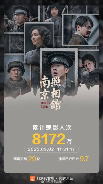 据灯塔专业版数据,截至9月2日11时31分,影片《南京照相馆》票房突破29亿,引发影视市场广泛关注,体现观众对优质内容的认可。