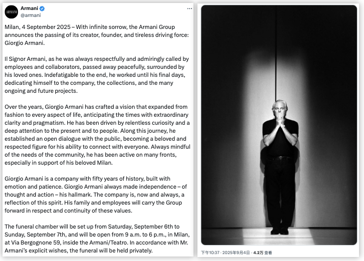 公司披露:“阿玛尼先生(Il Signor Armani)——正如员工与合作伙伴一贯怀着敬意与钦佩之情称呼得那样——在挚爱亲人的陪伴下安详辞世。直至生命的最后时光,他依旧矢志不渝,投身于公司、系列作品以及众多正在进行与未来的项目。”