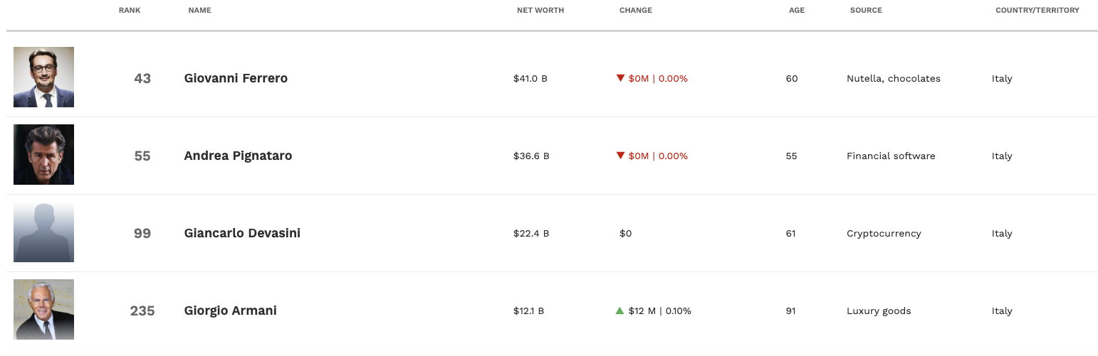 福布斯富豪榜显示,阿玛尼的财富达到121亿美元,位列意大利第4,全球第235位。