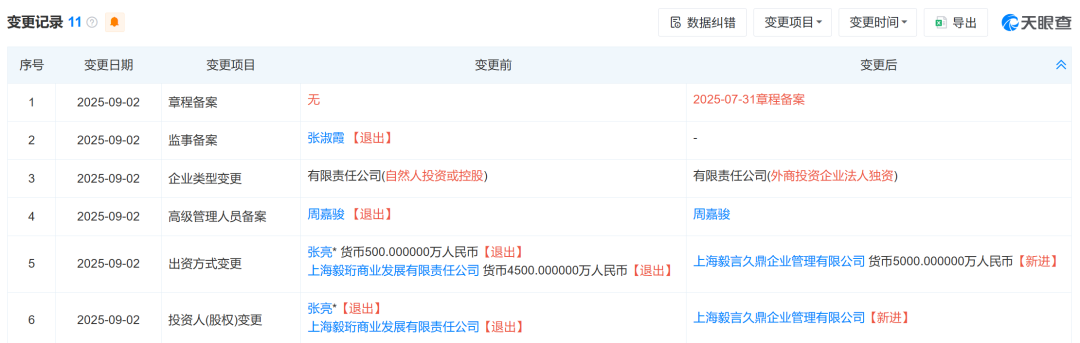 天眼查APP显示,9月初,张亮麻辣烫关联公司——张亮企业管理(集团)有限公司发生工商变更。上海毅言久鼎企业管理有限公司作为新的控股股东,持有张亮企业管理(集团)有限公司100%股权,认缴出资额5000万人民币。原股东上海毅珩商业发展有限责任公司(持股90%)和创始人张亮(持股10%)退出股东行列,标志着公司股权结构迎来重大调整。