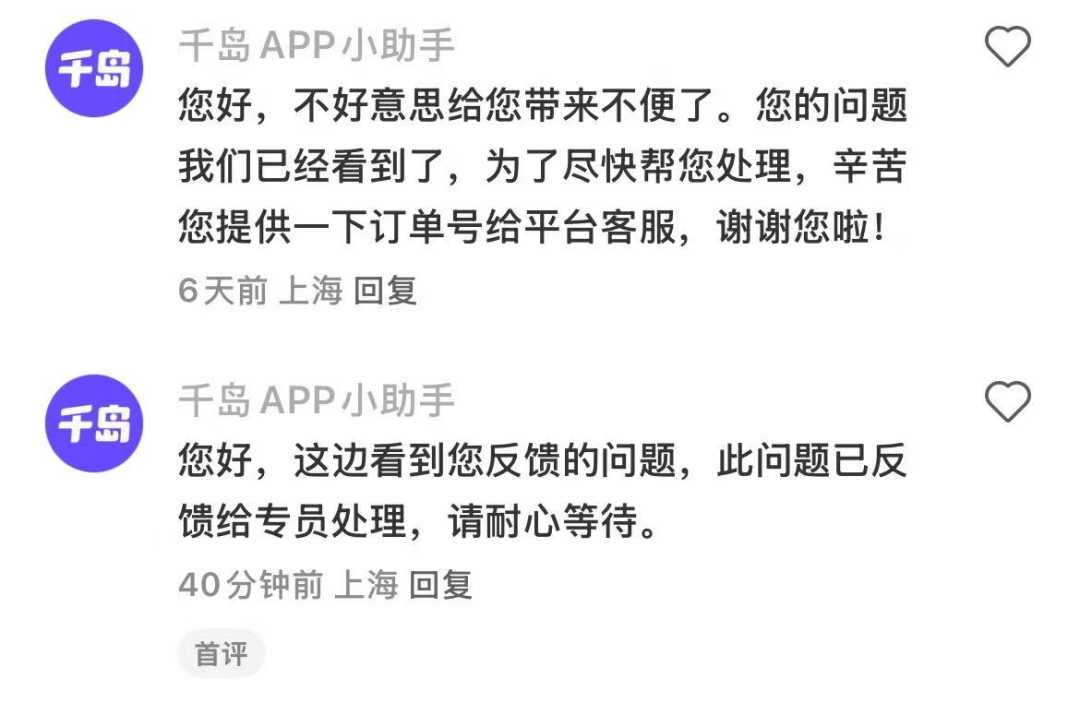 比起Jason来说,佳佳的售后时长已经算短。Jason告诉蓝鲸新闻记者,自己在APP联系客服进行售后时,排队一小时是常见现象,“每一次都大排特排,完全没有办法和客服沟通彻底”。为了能够联系到售后,不少网友表示自己先后辗转多个平台,除千岛APP外,千岛微信公众号留言、社交平台发帖也都是消费者的必经之路。这其中获得反馈最快的是社交平台发帖,“吐槽贴”发出后,评论区大概率会出现千岛官方账号的留言。