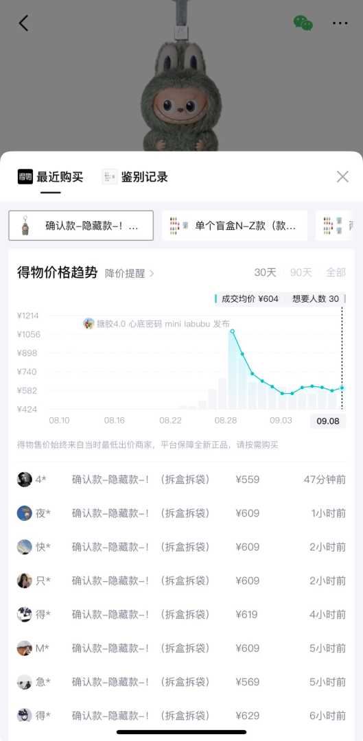 得物App数据显示,迷你版Labubu发布十天以来,热度不减,截至9月8日,销量已达到8.1万,另外还有14万用户“想要”。与此同时,迷你版Labubu价格持续跳水。目前,其中端盒(N~Z)价格由峰值1915元下跌至1429元,回落约25%,端盒(A~M)价格由峰值2034元回落至1799元,回落约12%。单个未拆盒盲盒(N~Z)成交价下降了35%,未拆盒盲盒(A~M)成交价下降了27%,价格下滑趋势显著。