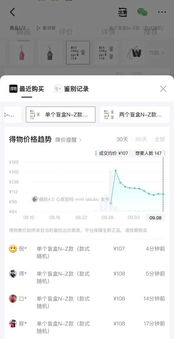 然而,热度并未持续太久,截至9月8日,得物app平台数据显示,迷你版Labubu成交均价为107元,整盒(14只)价格已回落至1446元,虽仍有溢价,但相较发售前期已有大幅回落超50%,潮玩市场回归理性。
